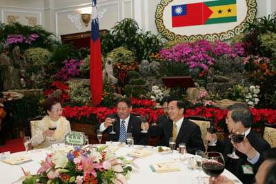 陳總統水扁先生今天中午在總統府大禮堂以隆重國宴款待率團來訪的聖多美普林西比民主共和國總統梅尼士(Fradique Bandeira Melo de Menezes)及訪問團一行。宴前,總統並接受梅尼士總統頒贈的聖多美普林西比民主共和國獨立30週年獨立獎章。