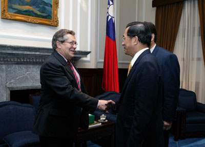 「亞太民主與安全的願景」國際研討會與會外賓馬丁.愛德蒙博士(Martin Edmonds)等一行,上午由國防部副部長蔡明憲及國防政策與戰略研究學會理事長林正義陪同,前來總統府晉見總統,總統府副秘書長黃志芳也在座。