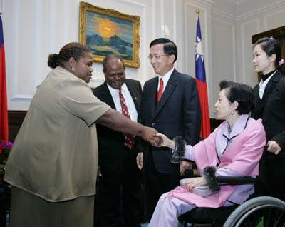 陳總統水扁伉儷今天上午由呂副總統秀蓮女士陪同,接見索羅門群島總理柯瑪克札(Allan Kemakeza)伉儷一行,代表中華民國政府與人民表達歡迎與感謝之忱。
