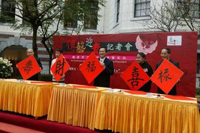 陳總統水扁先生今天上午出席「總統府文化台灣特展記者會」,除欣賞薪傳獎得主楊秀卿女士及民間藝人許麗雲女士合唱「歡喜台灣慶豐年」,並應邀致詞,隨後並在現場與行政院文建會主委陳其南、前主委陳奇祿等人揮毫寫春聯。