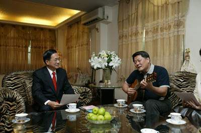稍早,總統拜訪第二屆「台灣之歌」得獎作品<台灣>詞曲創作者王明哲,關心王明哲創作情形,總統說第一次聽到<台灣>這首歌曲時,他心中很感動,讓他不得不喊「encore」;對於這樣既好聽又能述說對台灣感情的歌曲,總統期許國人應該多傳唱。在離去之前,總統並與王明哲及在場陪同的文化總會秘書長陳郁秀、高雄市代理市長葉菊蘭、內政部長李逸洋、總統府副秘書長卓榮泰等人一起合唱該首歌曲。