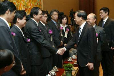 非常高興能夠有機會在總統府這一棟台灣最具有特色的建築物,與各位建築金石獎的得獎代表晤面。建築業是經濟發展最重要的火車頭產業,建築業的發展與進步也反映台灣都市與城鄉的成長與繁榮。「中華建築金石獎」甄選活動已經舉辦十三屆了,也就是說「金石獎」親自見證了台灣城鄉的發展也有十三個年頭,而在座的各位業界先進,正是推動這一切進步的重要推手,阿扁在此不但要向每一位得獎的代表致上最誠摯的祝賀之意,更要藉此機會向所有建築業界的同業與工作同仁表達最高的敬意與由衷的感謝之忱。