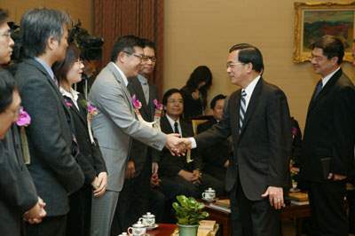 陳總統水扁先生今天上午接見「第13屆中華建築金石獎」得獎企業代表,除對他們表達賀意,也對所有建築業界推動城鄉進步的努力,申致敬意與謝意。