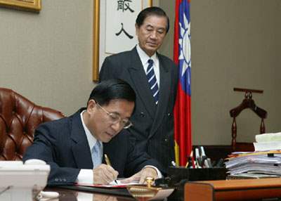 總統簽署時,總統府秘書長陳唐山也在場。