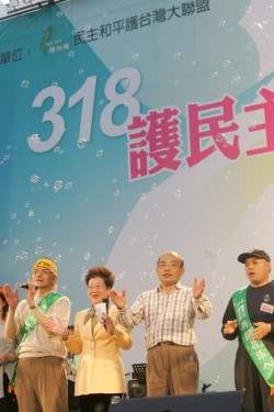 呂副總統秀蓮女士今天下午參加「318護民主反併吞大遊行」活動,除對在炎熱天氣下長距離徒步,展現對台灣赤熱的愛所有遊行民眾表達高度肯定外,並在致詞後與行政院蘇貞昌院長共同見證現場民眾將「民主台灣、世界都在看」大型長布條以接力方式傳向地球,代表民主台灣與世界接軌,和平氣球此時也冉冉升空,現場響起一片熱烈掌聲。