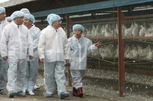 早上阿扁在蘇院長陪同下,先後視察了南寮漁港新竹海巡隊以及國家衛生研究院竹南院區,下午則特別來到「恆生牧場」,巡視養雞場圍網防鳥的工作,這是強化養禽場與養豬場自衛防疫系統非常重要的一環。我們能夠管制人員和物品的進出國境,但卻無法防止候鳥的遷徙與停留,如何防止本土家禽與候鳥的接觸,是當前預防禽流感病毒入侵及擴散最重要的工作之一。依據剛才農委會的報告,國內養雞場及養豬場圍網的執行率將近百分之百,但水禽場的執行率只有76%,這一部份是不是可以再加快進度,早一天完成,也早一天讓大家安心。