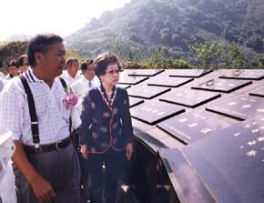 副總統首先抵達為紀念九二一震爆點的南投縣國姓鄉九份二山,向罹難者紀念碑獻花外,也聽取行政院農委會水土保持局局長吳輝龍的簡報,副總統在致詞時表示,三年前發生的九二一地震對很多人而言,可用十二個字形容,即天崩地裂、山河變色、家破人亡,地震罹難者家屬過去三年一路走來的心路歷程,她個人也有深層感觸,特別是國姓鄉有三十九人罹難,其中十七人尚未尋獲遺體,對此,副總統請家屬節哀,並以死者已被天葬的形容詞,來安慰家屬,她說,那些罹難者都是無辜而代我們受罪的菩薩,大家應感謝他們。