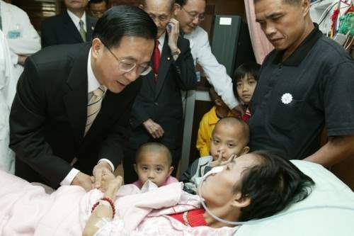 陳總統水扁先生今天南下台中中山醫學大學附設醫院安寧病房探視吳慧萍女士,為她加油打氣,一定要保重、要堅強、要勇敢。