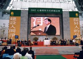 陳總統水扁先生今天上午與聖嚴法師、樞機主教單國璽及立法院長王金平共同為「二OO二心靈環保全民博覽會」按鈕揭幕及簽署心靈環保全民宣言,並應邀致詞。