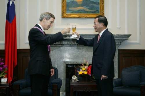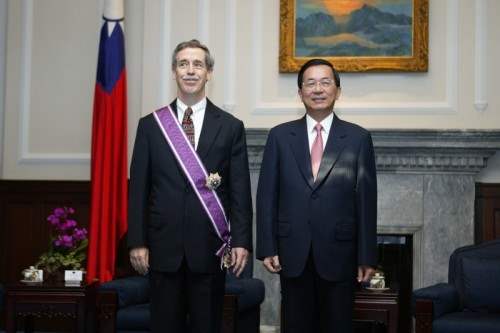 陳總統水扁先生今天上午代表中華民國政府與人民頒授「紫色大綬景星勳章」給美國在台協會台北辦事處副處長葛天豪(David J. Keegan),以表彰他致力提升台灣與美國間的友好合作關係,以及促進兩國人民真摯友誼所作出的卓越貢獻。
