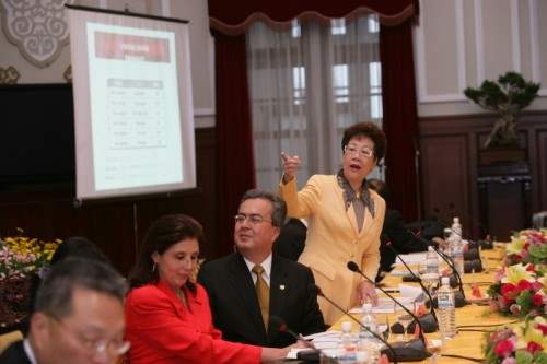 副總統在綜合答覆時首先以她一手主導成立的「民主太平洋聯盟」為例鼓舞在場產官學界共同為台灣在國際發聲而努力,副總統指出,該聯盟結合環太平洋28個愛好民主、自由、和平的國家組成,目的在促進世界的民主、和平與繁榮,未來將推動多項甚有意義活動,包括今年6月1日在韓國首都首爾(Seoul)召開西太平洋會議,7月份於印尼召開關於禽流感國際會議等,希望把台灣發展模式逐漸推展出去,為世界的進步繁榮奉獻心力。