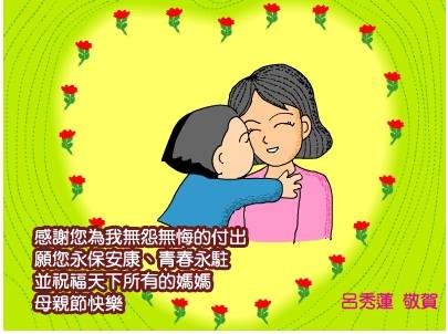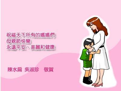 總統府公共事務室今天表示,這個星期天是一年一度溫馨的母親節,總統伉儷及副總統分別透過總統府全球資訊網發出電子賀卡,祝福全天下的媽媽們「母親節快樂!」