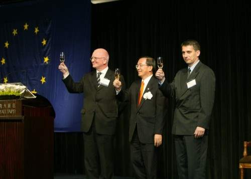 今天本人非常高興再一次應邀前來參加由「歐洲商務協會」所舉辦的「歐洲日」晚宴,和所有來自「歐盟」各國的朋友們歡聚一堂。大家都知道,1950年5月9日,由當時法國的外交部長羅伯特‧舒曼倡議組織「歐洲煤鋼共同體」,獲得比利時、西德、盧森堡、法國、義大利及荷蘭等六國的支持,從此奠定了「歐盟」的基礎。所以,於1985年在義大利米蘭所舉行的「歐盟理事會」通過決議,每一年的5月9日為「歐洲日」,也就是「歐盟」的生日。在此,本人謹代表二千三百萬的台灣人民,向歐盟二十五個會員國,四億五千萬的人民,表達最誠摯的祝賀之意,敬祝「歐盟」生日快樂,並祈求歐洲能永享和平、進步與繁榮。