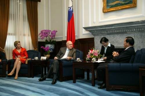 南非前總統戴克拉克伉儷,上午由外交部長黃志芳陪同前來總統府晉見總統,總統府副秘書長卓榮泰也在座。