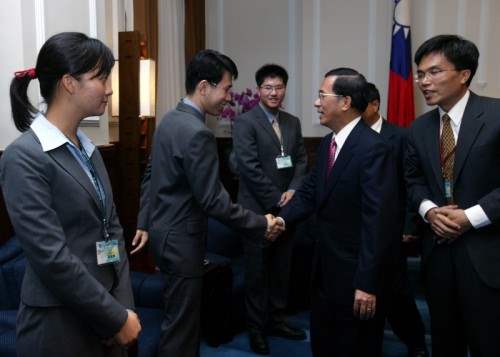 我國參加「第五十七屆英特爾國際科技展覽會」學生代表,包括國立臺灣師範大學附屬高級中學趙依祈、國立高雄師範大學附屬高級中學蔡辰葳、臺北市立麗山高級中學李詔熙、陳永介、高雄市立五福國民中學莊迪喬、高雄市私立道明高級中學莊淳喬、臺北市立第一女子高級中學陳欣榆、國立嘉義高級中學高頌凱、國立新竹高級中學郭博鈞、國立新竹女子高級中學陳虹汝、楊旻儒、臺中縣私立弘文高級中學陳冠皓,與參展指導老師林榮耀教授、雷添壽教授、李文獻教授、陳義裕教授、張大慈教授、蔡愉玲老師、盧錦玲老師、黃淑芬老師,下午由教育部長杜正勝及國立台灣科學教育館館長柯正峰陪同,前來總統府接受總統道賀,總統府副秘書長卓榮泰也在座。