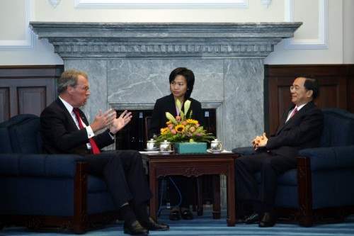美國在台協會理事主席薄瑞光上午由外交部長黃志芳、美國在台協會台北辦事處處長楊甦棣(Stephen Young)陪同,前來總統府晉見總統,總統府秘書長陳唐山也在座。