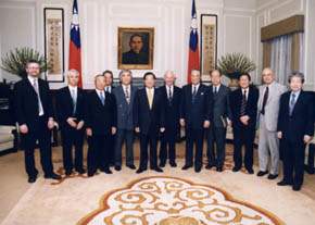 「台灣、英國、日本產業技術論壇」與會代表一行十餘人,下午由外交部次長邱榮男、總統府國策顧問辜濓松陪同,前來總統府晉見總統。總統府秘書長陳師孟也在座。