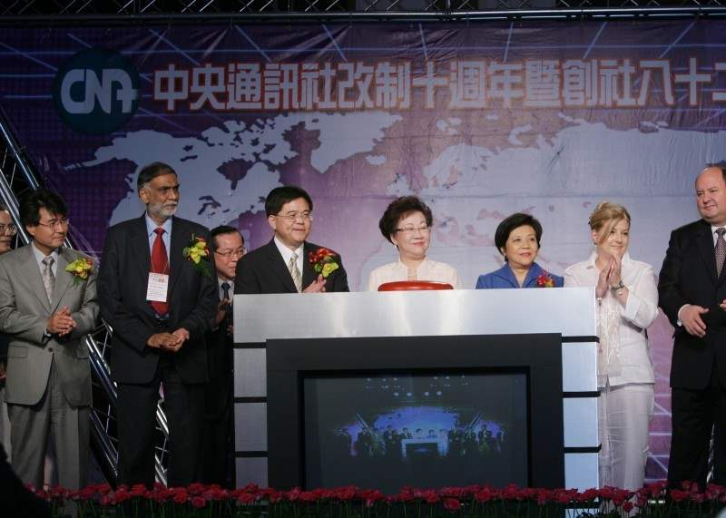 致詞後,副總統並與中央通訊社董事長蘇正平、社長劉志聰及路透社、美聯社、法新社、日本共同通訊社、日本時事通訊社、泰國大眾傳播機構、印度聯合新聞社、韓聯社等應邀來台參加社慶活動的代表共同按鈕,啟動慶祝儀式。
