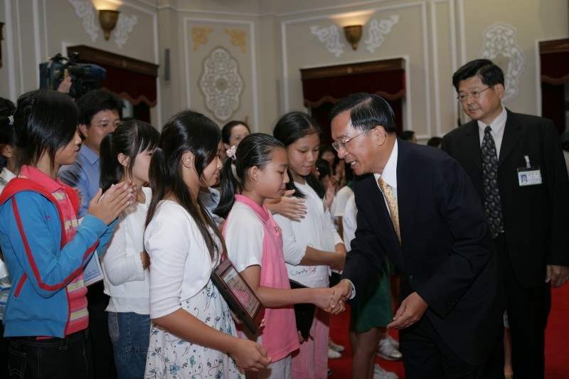 我國參加2006年國際學校網界博覽會優勝隊伍代表,上午由教育部次長吳財順、台灣資訊教育發展協會理事長邢禹倩等陪同前來總統府接受總統道賀。