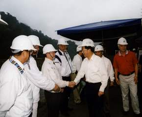 之後,總統轉往台中縣和平鄉自由村關心流域整治工程重建情形及聽取農委會水土保持局局長吳輝龍簡報河床疏濬崩坍地處理、防砂工程等簡報,並視察生態工法施作情形。