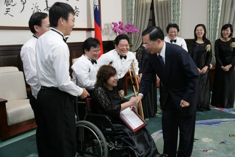 本人近日也有機會經常下鄉,走遍全國各地,看看一些弱勢的機構和朋友,以及為社會無私奉獻服務的典範,在和他們交談之間,試著體會到所謂簡單的感動和快樂,像現在已經是大學三年級的鄭易嘉,天生是聽力障礙,但是他立志做全世界最好吃的藝術蛋糕;像已經是17歲的邱俊瑋,罹患肌肉萎縮症,正在和生命賽跑,但卻畫出了最具有生命力的圖畫創作。這些感人的故事在台灣每一個角落都可以發現。我知道「廣青合唱團」的團員們最喜歡唱的一首歌叫做「沒有翅膀,一樣可以飛翔」,雖然各位不是專業的音樂家,有時因為身體障礙的關係,練唱的時候也需要克服一些困難,但我相信,最好聽的聲音是用心發出來的聲音,感謝「廣青合唱團」讓全世界都能夠聽見來自台灣最動人、最美妙的聲音,再次恭喜大家。