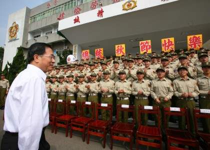 今天是中秋節,陳總統水扁先生上午以三軍統帥身分前往國軍單位部隊視導官兵弟兄戰備情形、慰勉辛勞,並祝賀中秋佳節快樂。