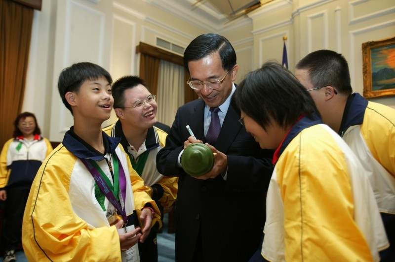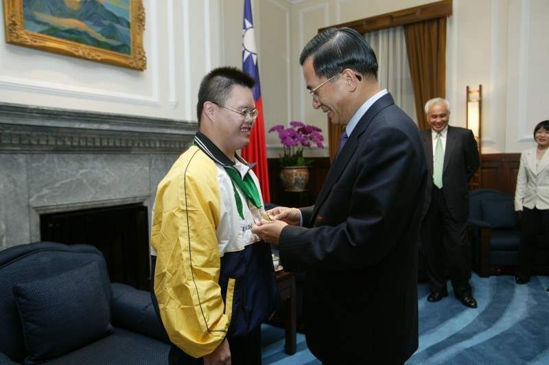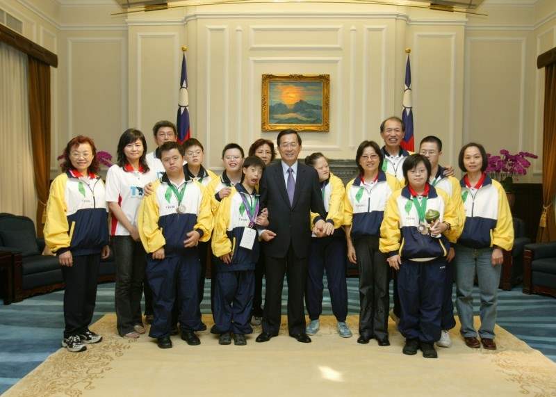 陳總統水扁先生今天下午接見我國參加「第三屆世界唐氏症游泳錦標賽」選手,對參賽選手贏得13面金牌、9面銀牌、6面銅牌的佳績,並且打破多項世界紀錄,充分展現運動精神以及為台灣打拼、加油的毅力與勇氣,他代表全體國人同胞致上最高的敬意與賀意。
