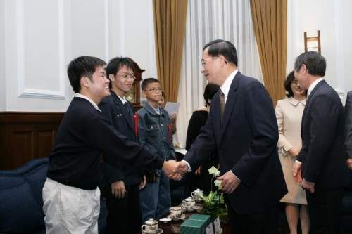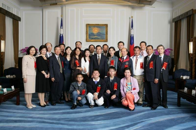 95年推動環境保護有功績特優團體代表及人員,上午由行政院環保署署長張國龍、教育部次長吳財順陪同,前來總統府接受總統道賀,總統府副秘書長卓榮泰也在座。