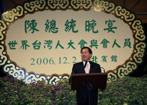 陳總統水扁先生今天晚間出席世界台灣人大會(WTC)第6屆年會晚宴,對與會鄉親此間返國、以及捍衛民主、愛家愛國的堅定情誼,代表台灣政府與兩千三百萬台灣人民,表達最高的敬意與感謝之意。