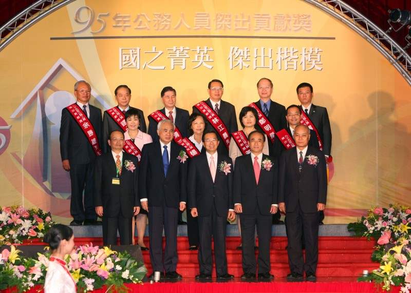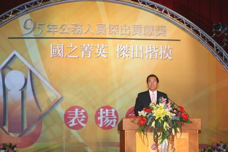 今天非常高興能應邀參加95年公務人員傑出貢獻獎表揚大會,首先,本人要代表政府向各位得獎人表示最誠摯的祝賀之意。各位得獎者,都是政府各部門的菁英,各位對工作的奉獻與精神,更是公務人員的最高標竿和學習楷模,不愧是大會所揭示「國之菁英、傑出楷模」的最佳表率。