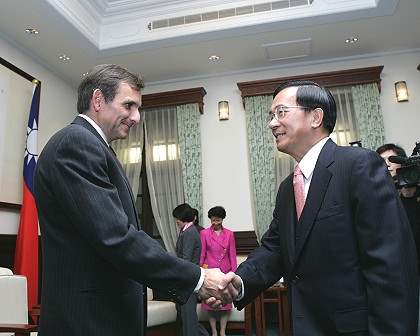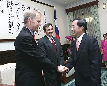 陳總統水扁先生今天上午接見美國華府智庫「布魯金斯研究院」訪問團,對能與副院長裴寇爾(Carlos Pascual)、東北亞政策研究中心主任卜睿哲(Richard Bush)及中國研究中心資深研究員黃靖晤面,表達歡迎之意。