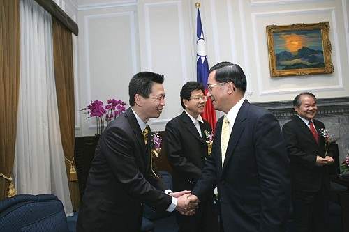 第八屆國家建築金質獎得獎廠商代表一行,下午由立法委員藍美津陪同,前來總統府接受總統祝賀,總統府副秘書長卓榮泰也在座。