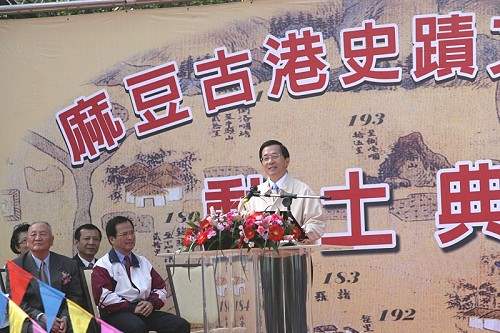 結束南勢村里關懷中心行程後,總統出席「麻豆古港暨水堀頭史蹟文化園區第一期工程」動土典禮。總統並參觀麻豆古港特展圖片,了解「水堀頭」的歷史與文化,致詞後,也參訪「水堀頭遺址」,親自感受遺蹟美麗的風貌。