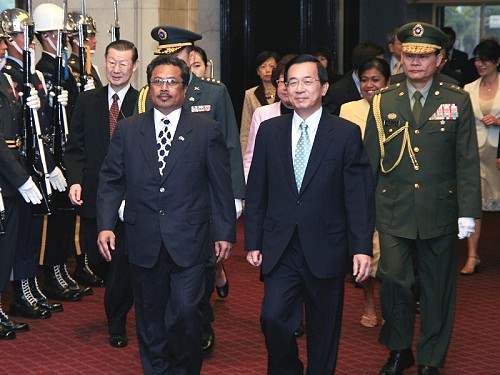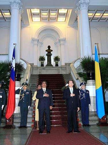 軍禮歡迎儀式上午九時三十分在總統府敞廳舉行,在鳴放21響禮砲及演奏台、帛兩國國歌後,兩國元首分別致詞。呂副總統秀蓮女士、中央政府首長及駐台使節團也參加歡迎儀式。