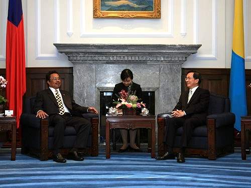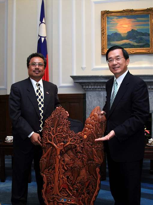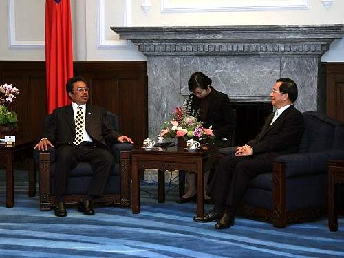 帛琉共和國總統雷蒙傑索伉儷偕訪團一行上午由我國外交部長黃志芳夫婦陪同,前來總統府與陳總統會晤。總統府秘書長陳唐山也在座。