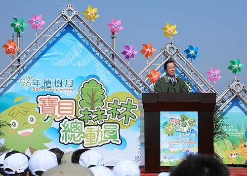 陳總統水扁先生今天上午到屏東參加由行政院農業委員會所主辦的「寶貝森林總動員-96年植樹月主題活動」,除應邀致詞並頒發綠美化社區模範獎外,並帶領現場民眾將零錢投入竹製存錢筒中,在「一元復始,竹報平安」呼聲後一同搖響愛心,隨後也親手栽種蘭嶼羅漢松,為屏東農業生物科技園區的綠美化工作,種下希望,許下願景。