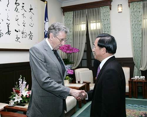 陳總統水扁先生今天上午接見英國國會上議院保守黨副領袖賀爾勳爵(The Lord Howell of Guildford),對他在暌違10多年後再次蒞台訪問,代表政府與人民表達竭誠的歡迎與感謝之意。