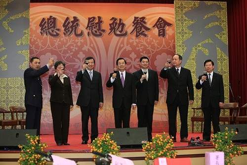 陳總統水扁先生今天晚間出席內政部警政署年終慰勉餐會,向全年犧牲奉獻、全心全力投入社會治安工作的全體警察同仁以及寳眷們拜早年,並預祝他們新的一年吉祥如意、諸事順心。