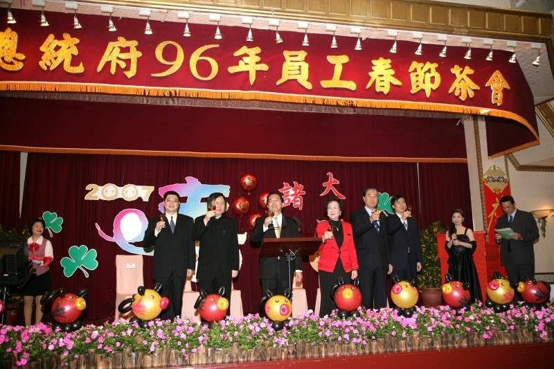 陳總統水扁先生與呂副總統秀蓮女士今天晚間由總統府秘書長邱義仁陪同,參加總統府96年員工春節茶會,並和全體員工舉杯共同慶祝新年快樂。總統府前祕書長陳唐山也應邀與會,為同仁們帶來最衷心的祝福。