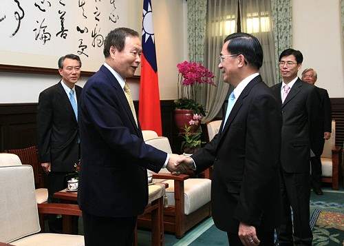 韓國前憲法裁判所所長尹永哲下午由法務部次長李進勇陪同,前來總統府晉見總統,總統府副秘書長陳其邁也在座。