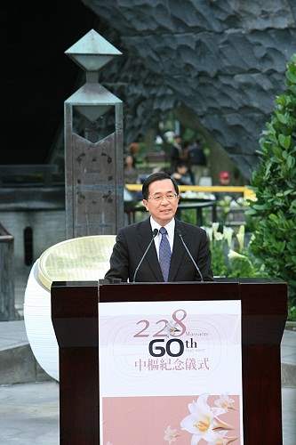 我知道六十年是非常長的時間,過去政府對「二二八事件」的處理已經做了一些,但也有很多一直沒法度來完成。我在這要向大家保證,六十週年紀念絕對不是講代誌到這就結束,六十週年紀念是一個新的階段的開始。未來咱工作的重點會放在責任的追究,透過對每一位施暴者和加害者法律責任的追究,咱才有法度瞭解每一位受難者和被害者,當初是如何受到迫害以及是為何來犧牲。等到有一天,歷史的真相能夠大白,公平和正義自然就有法度來實現。