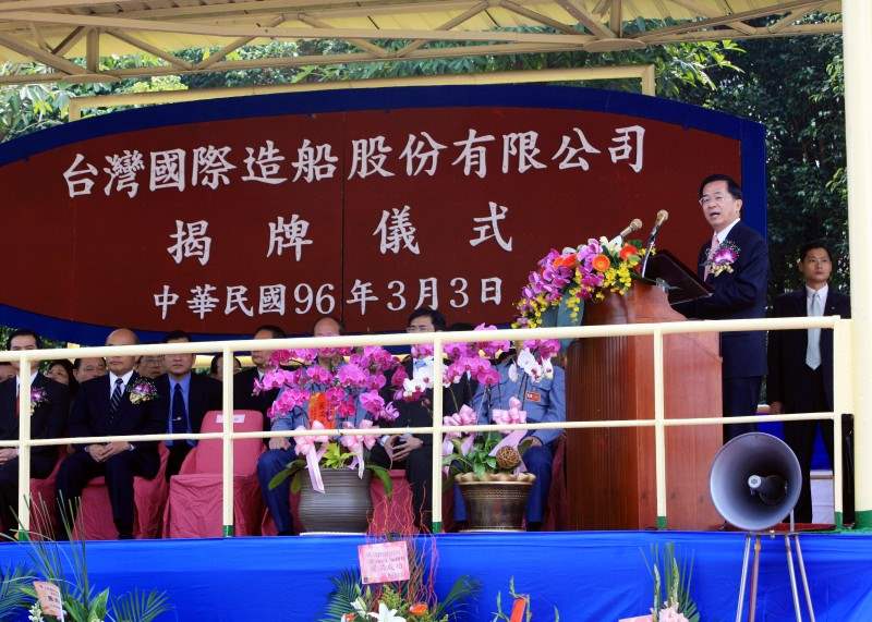 今天非常高興能夠應邀前來參加「台灣國際造船公司」的揭牌典禮,2001年12月31日,我們見證了「中船」的再生,2007年3月3日我們一起迎接「台船」的新生,這不但象徵貴公司將邁入一個新的歷史里程碑,也將為台灣的造船業揭開一個更光輝燦爛的時代。