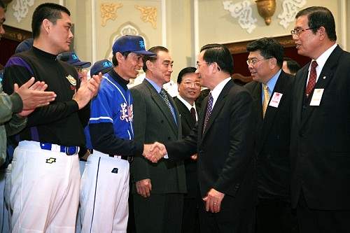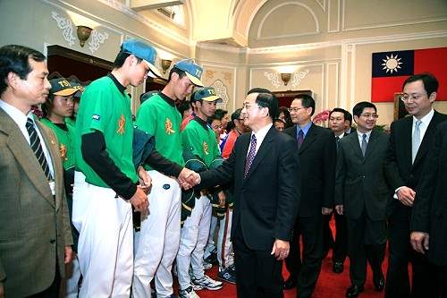 「第四屆總統盃全國慢速壘球錦標賽」冠軍隊伍下午由行政院體委會副主任委員陳雨鑫、陳榮盛陪同,前來總統府晉見總統,總統府副秘書長卓榮泰也在座。