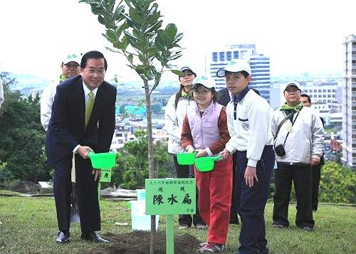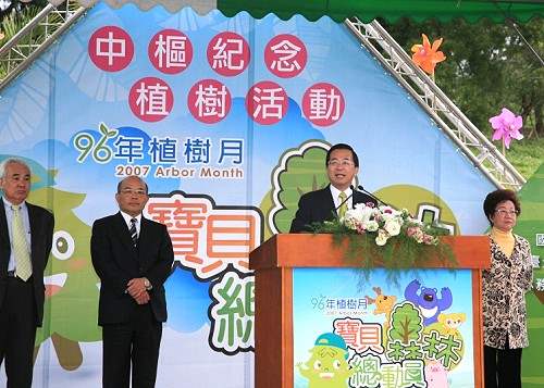 總統致詞時也呼籲國人,一起響應行政院農委會今年植樹月的主題「寶貝森林總動員」,一起動起來,讓綠色的森林,遍布在高山、平地及海邊,讓台灣成為一座生生不息的綠色矽島。