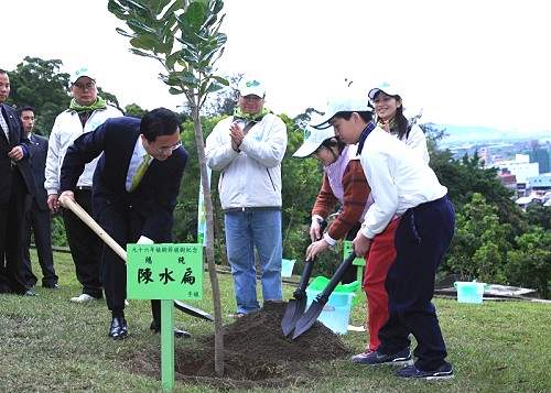 今天是植樹節,陳總統水扁先生今天上午參加由行政院農業委員會舉辦的中樞紀念植樹活動,在呂副總統秀蓮女士陪同下,前往關渡台北藝術國立大學植樹,親手種下台灣原生種大葉山欖一株。
