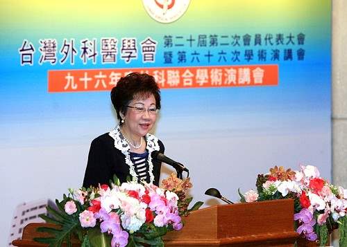 副總統表示,台灣的外科醫生都受到非常專業的訓練,對病人的照顧不因階級、貧富而有所不同,讓民眾能安心的接受治療,發揮高度的專業素養,值得讚許;她也特別提醒醫師們除了照顧病人,更應照顧自己的身體,同時期許他們除專業造詣外,可以多做外交工作,台灣目前雖然無法加入WHO,但是如果能展現醫學成果,將之與外交結合,讓全世界看到台灣優秀的醫療品質,將會有很大助益。