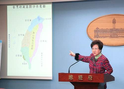 談到行政區重新劃分問題,副總統指出,以2005年為例,政府用在台北市的人均歲出為新台幣53,727元,高雄市為37,294元,台北縣為21,122元,因為直轄市獨享非常豐富的國家資源,因此,沒有必要再增加直轄市,以免造成更劇烈的城鄉差距。因此她主張,以四生共榮—「生產、生態、生活、生命」—的創新思維新視角,將行政區域重新作一番整合,設置四省—台北省、台中省、台南省與台東省;兩個特別行政區—高山特別行政區、離島特別行政區;雙都—台北都與高雄都,必能縮短城鄉距離、均衡城鄉發展,為台灣的進步開創新思維與新視野。