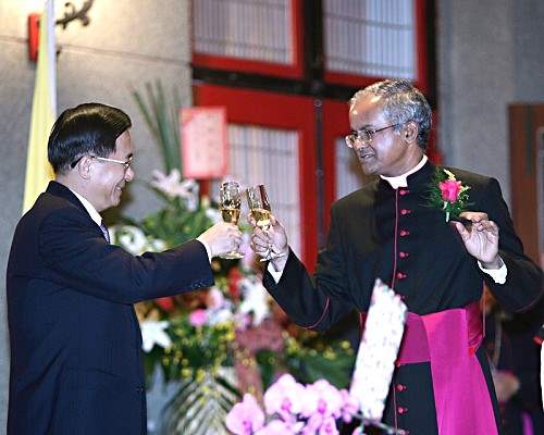 陳總統水扁先生今天晚間出席教廷駐台大使館慶祝教宗就任二週年慶祝酒會,代表我國政府及二千三百萬台灣人民,向教宗表達最誠摯的祝賀之意。