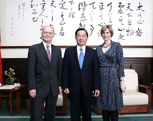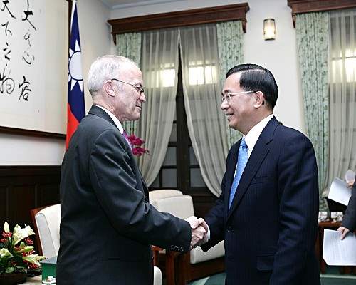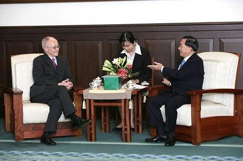 2004年諾貝爾經濟學獎得主席德蘭博士夫婦,由經濟日報社長胡立台、中華經濟研究院院長蕭代基及力晶集團董事長黃崇仁陪同前來總統府晉見總統。總統府副秘書長陳其邁也在座。