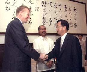陳總統水扁先生今天上午接見菲律賓自由黨主席阿巴德(Florencio B. Abad)及德國諾曼基金會常駐菲律賓代表梅納德斯博士(Ronald Meinardus),對兩位訪賓的來訪表達誠摯歡迎之意 。